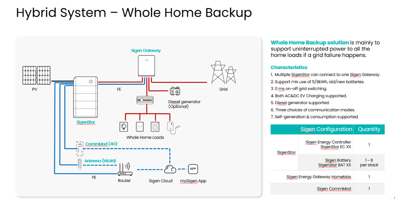⚠️ La version back-up complète nécessite l’installation d’un coffret GATEWAY mono & triphasé. Elle ne nécessite pas l’intégration d’un compteur “SIGEN SENSOR” car toute l’énergie du système est décomptée via le GATEWAY.