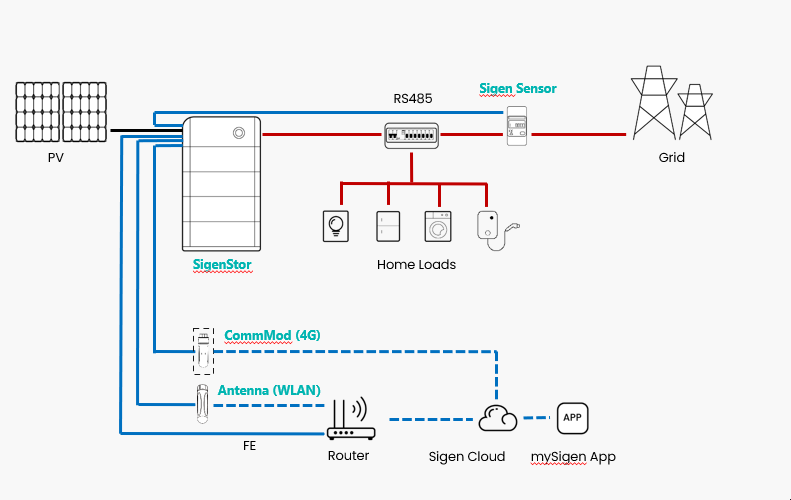 🌐 Pour bénéficier de la garantie de 10 ans, les systèmes SIGENSTOR doivent obligatoirement être connecté à internet (sur le cloud My Sigen). Plusieurs méthodes de connexion sont disponibles : Ethernet (RJ45), Wifi, ou 4G. Nous recommandons pour plus de stabilité une connexion Ethernet RJ45.