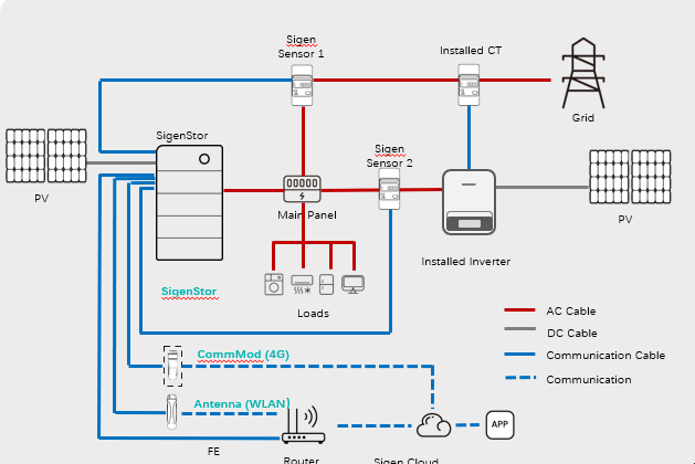 ❓ L’intégration d’un onduleur PV en rétrofit (”AC COUPLING”) se fait via le rajout d’un compteur d’énergie (”SIGEN SENSOR 2”).